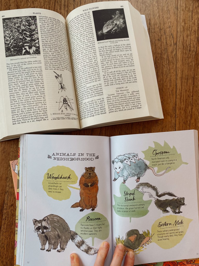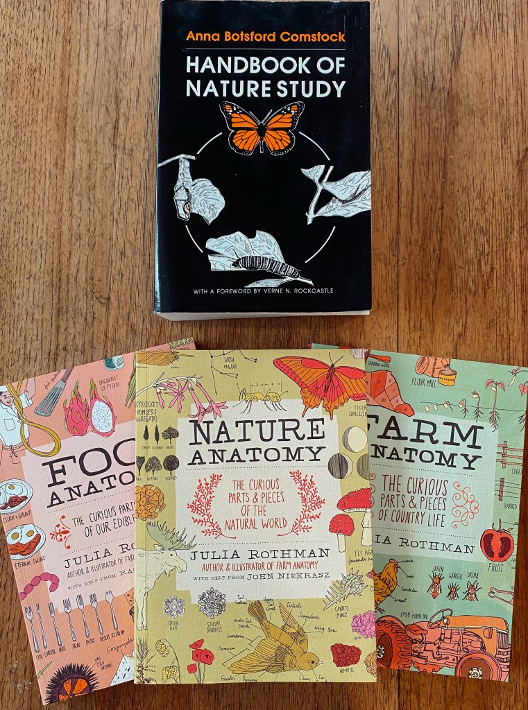 The Treehouse Schoolhouse Nature Study also has recommended reference materials by Comstock and Rothman pictured below. For the younger ages in particular, I don’t think these are absolutely necessary. The Rothman books have beautiful pictures and cover a wide variety of material, but the information provided is quite minimal. Handbook of Nature Study by Comstock is highly detailed, but not appropriate or super helpful for elementary kids. Finding related library books for each subject has been much more helpful than using these reference materials suggested.