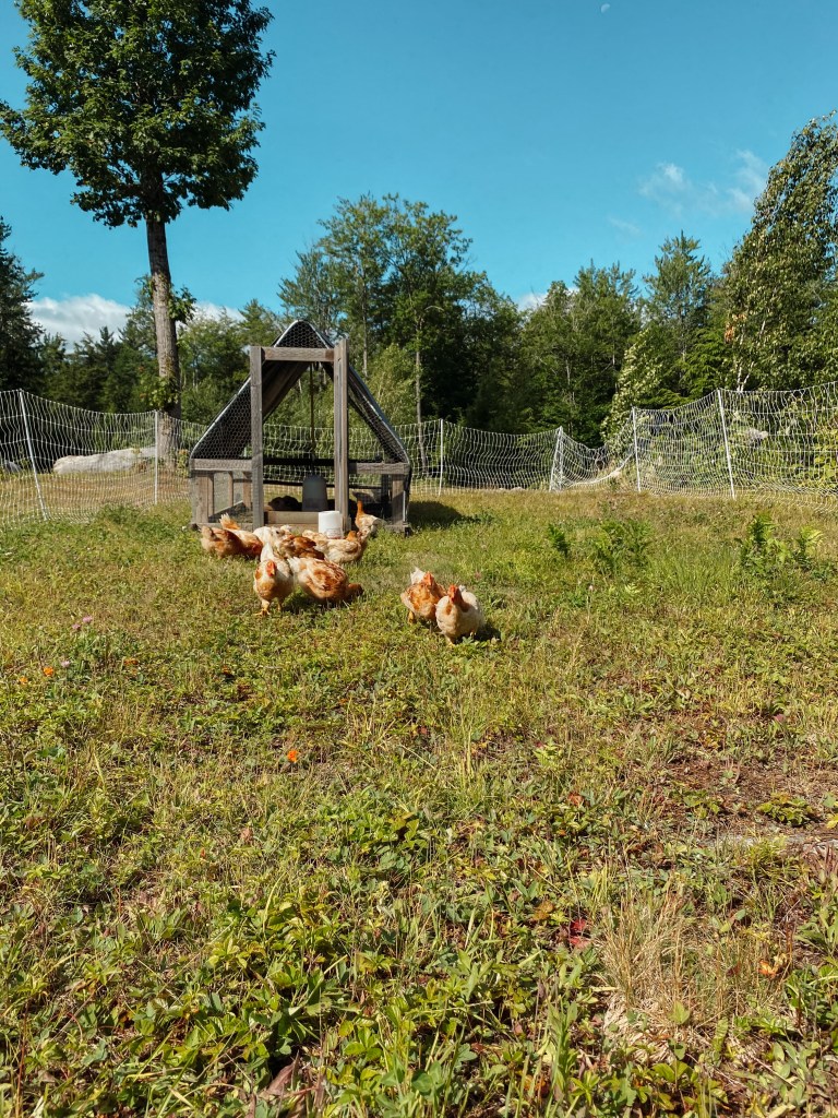 For a few years, we raised Ginger Broilers from McMurray Hatchery. We have been very happy with this breed. They are friendly and great foragers. In addition to the mobile chicken coop, they had access to free range in an electric fenced area, and they were active all day unless it was a very hot day.