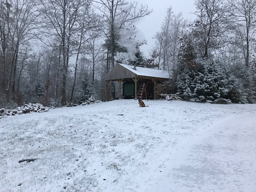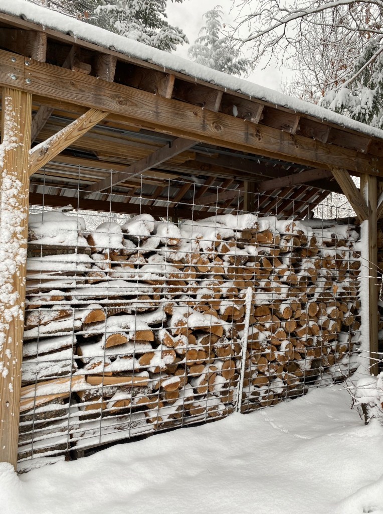 In order to make the daily chore of loading the boiler an easy one, my husband built a cover over the boiler and a large area for the firewood. After not having this woodshed the first winter we were here and digging out the firewood everyday under the snow and ice, we realized this was an important addition to the property. This keeps the rain and most of the snow off the wood, keeps a cover over our heads during bad weather, and holds lights that are super helpful during the dark evenings.