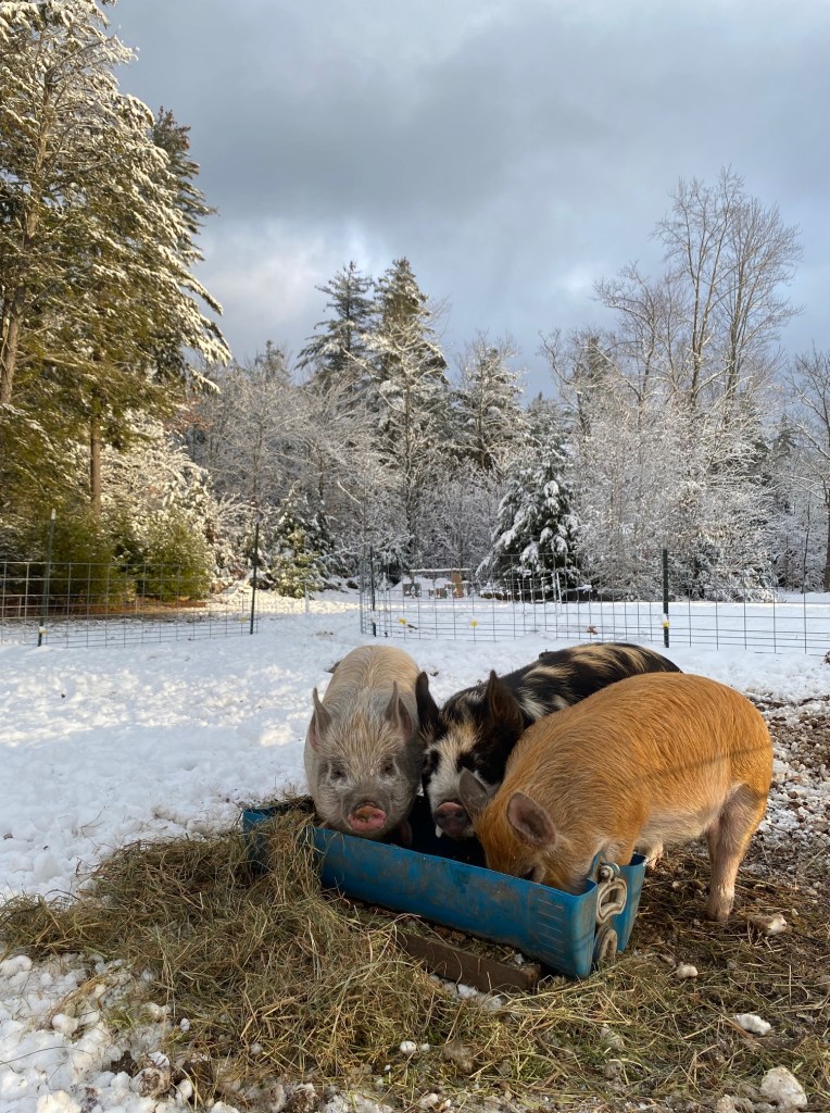 In the spring, the pigs will be moved to their large wooded area behind the wood boiler. But for now until the snow is gone, they will remain where they are. Going forward, we’ll have to figure out a better spot to set up the pigs for their winter home.
