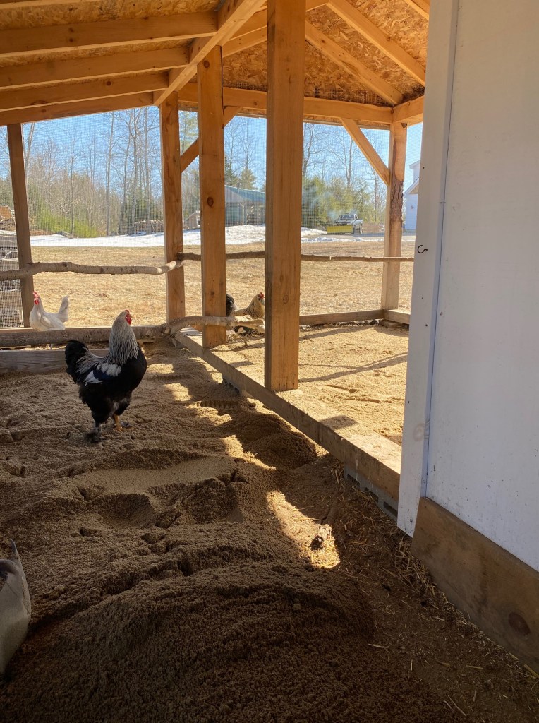 We also had winter in mind when building the coop back in 2020. We built it on the highest spot on the yard, added A LOT of sand to keep the run high and dry, and added a storage space in the coop.